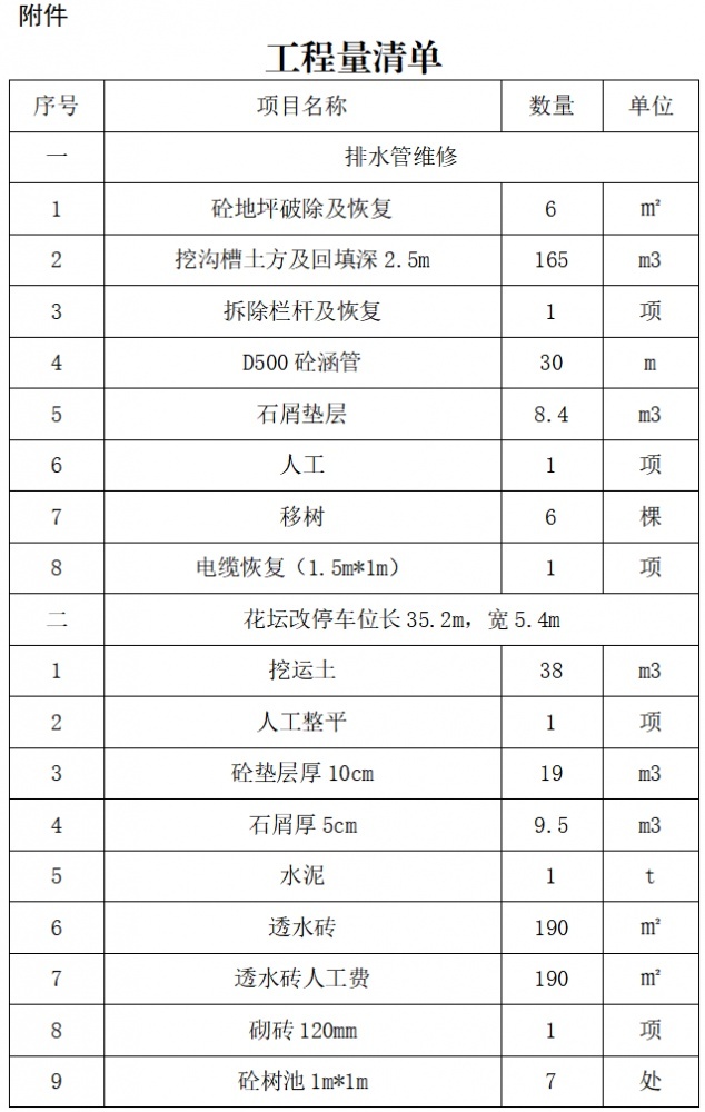 工程規(guī)模:排水管維修及修建停車位,具體內(nèi)容詳見工程量清單(附件)。